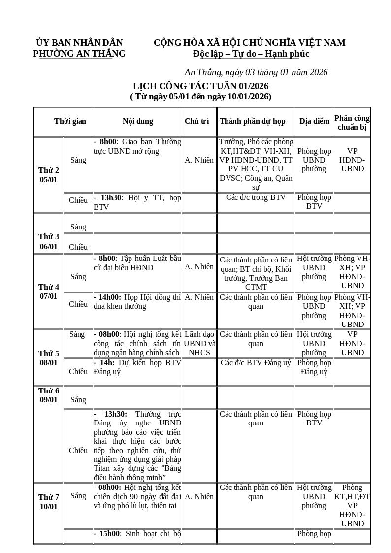| Tiêu đề văn bản | LỊCH CÔNG TÁC TUẦN 01/2026 ( Từ ngày 05/01 đến ngày 10/01/2026) | ||