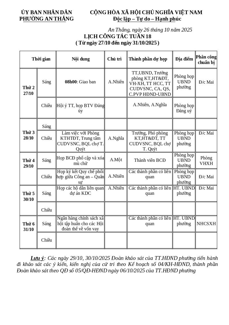 | Tiêu đề văn bản | LỊCH CÔNG TÁC TUẦN 18 ( Từ ngày 27/10 đến ngày 31/10/2025 ) | ||