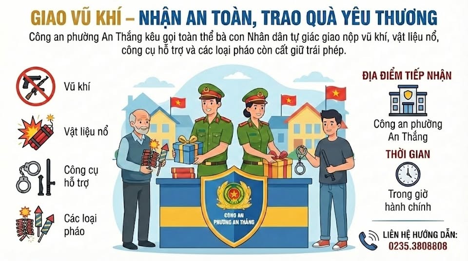 Thực hiện mô hình “Giao vũ khí - Nhận an toàn - Trao quà yêu thương”, Công an phường An Thắng kêu gọi toàn thể bà con Nhân dân tự giác giao nộp vũ khí, vật liệu nổ, công cụ hỗ trợ và các loại pháo còn cất giữ trái phép.