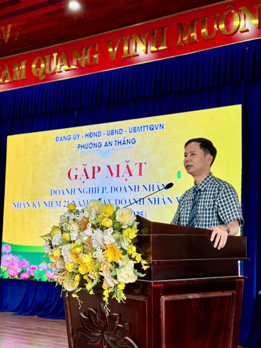 Đồng chí Nguyễn Xuân Hà, Bí thư Đảng ủy phường An Thắng, đã có bài phát biểu khai mạc đầy tâm huyết, nhấn mạnh: "Ngày Doanh nhân Việt Nam không chỉ là dịp để chúng ta tôn vinh những đóng góp thầm lặng mà vô cùng to lớn của lực lượng doanh nhân đối với sự nghiệp xây dựng và phát triển đất nước, mà còn là cơ hội để chúng ta cùng nhau nhìn nhận lại chặng đường đã qua, đề ra những định hướng cho tương lai. Cộng đồng doanh nghiệp, doanh nhân chính là lực lượng nòng cốt, là động lực quan trọng thúc đẩy sự phát triển kinh tế - xã hội của phường An Thắng chúng ta."