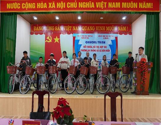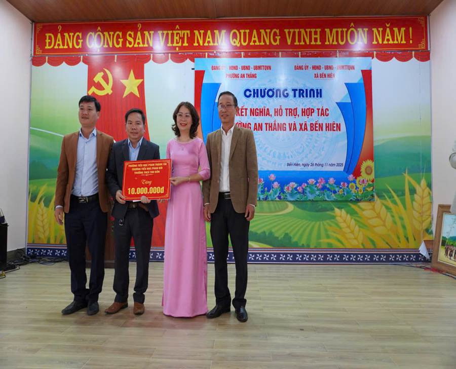 Cũng trong dịp này, Đảng ủy - HĐND - UBND - Ủy ban MTTQ Việt Nam phường An Thắng đã trao tặng 10 xe đạp cho học sinh có hoàn cảnh đặc biệt khó khăn; hỗ trợ 32 triệu đồng cho 5 trường học trên địa bàn xã Bến Hiên; trao 20 suất quà cho 20 hộ dân có hoàn cảnh khó khăn. Những phần quà tuy không lớn về vật chất nhưng chứa đựng tình cảm, tinh thần sẻ chia, gắn bó son sắc của Đảng bộ, chính quyền và nhân dân phường An Thắng đối với xã Bến Hiên, góp phần động viên các em học sinh và các hộ gia đình nỗ lực vươn lên trong cuộc sống.