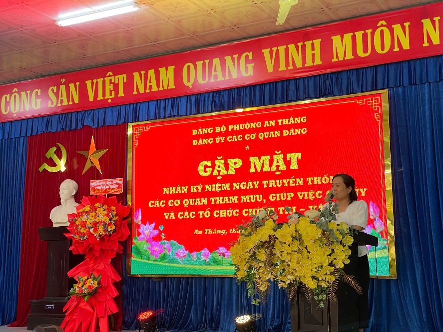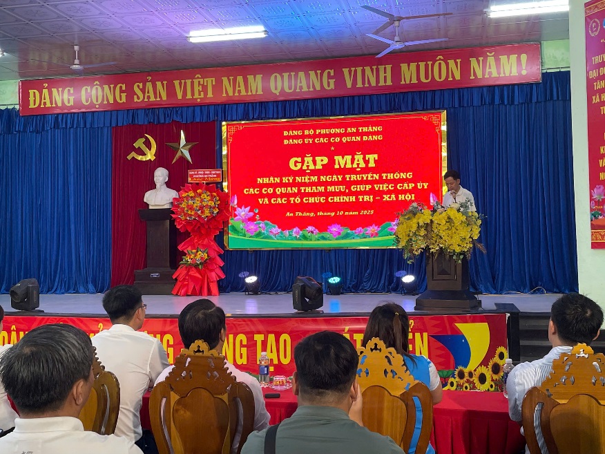 Ngày 11/10/2025, Đảng ủy các cơ quan Đảng phường An Thắng tổ chức các hoạt động chào mừng kỷ niệm Ngày truyền thống các cơ quan tham mưu, giúp việc cấp ủy và các tổ chức chính trị - xã hội. Đây là dịp để cán bộ, đảng viên tiếp tục phát huy tinh thần đoàn kết, trách nhiệm, nỗ lực hoàn thành tốt nhiệm vụ được giao, góp phần xây dựng Đảng bộ phường An Thắng trong sạch, vững mạnh.