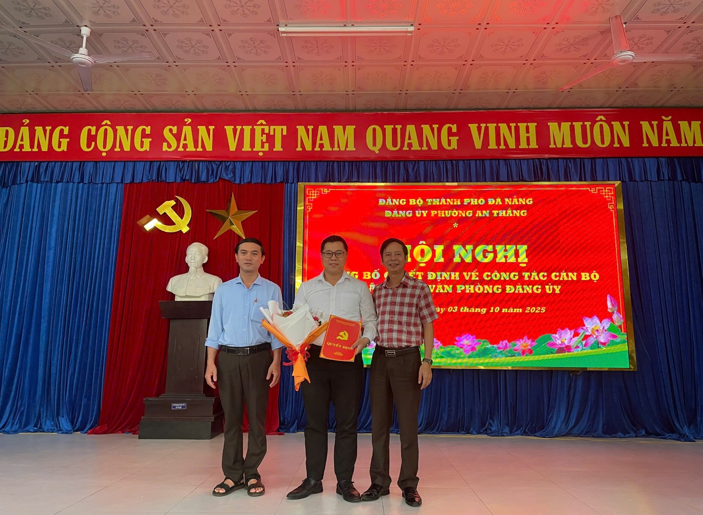 Sáng ngày 03/10/2025, Đảng ủy phường An Thắng tổ chức Hội nghị công bố và trao Quyết định tiếp nhận, bổ nhiệm cán bộ. Dự hội nghị có đồng chí Nguyễn Xuân Hà – Bí thư Đảng ủy, Chủ tịch HĐND phường An Thắng; đ/c Đoàn Thị Minh Nguyệt – Phó Bí thư Đảng ủy phường; đ/c Võ Minh Nam – UVBTV, Trưởng ban Xây dựng đảng Đảng ủy phường; đ/c Trần Văn Sơn – UVBTV, Chánh Văn phòng Đảng ủy phường và toàn thể cán bộ, công chức, người lao động của Văn phòng Đảng ủy.